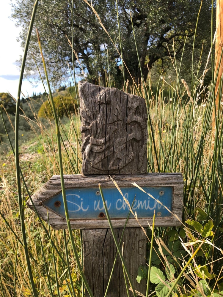 Nous descendons la ruelle, puis la petite route goudronnée à notre gauche. Au niveau du panneau de sortie de village, nous empruntons à droite le petit sentier qui se faufile dans les plantations d'oliviers. Le parcours est connu du plus grand nombre, mais chacun(e) est ravi(e) d'avancer le long des murets de pierres sèches (en bien mauvais état par endroits).