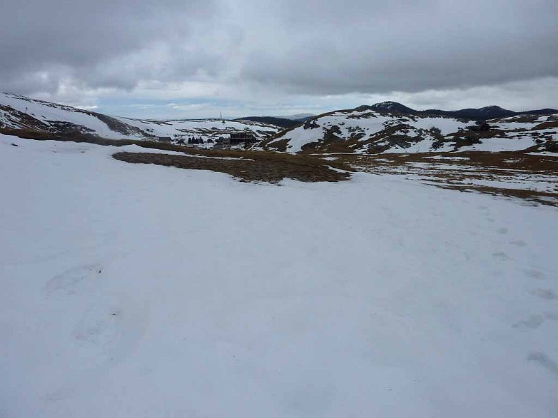 La pluie a cessé mais le ciel est bien bas. Nous croisons des attelages de chiens de traîneau et leurs équipages, la cohabitation est facile et amicale. La piste damée est bien enneigée en sous-bois, la pente se fait plus rude et certains peinent déjà, puis de petits flocons font leur apparition, grossissent au fur et à mesure de la prise d'altitude. On se couvre correctement et on continue après la séance " photos souvenirs ". Maintenant la neige tombe en gros flocons humides et collants, à l'arrivée au " Pot de la Croix " qui est la limite des "Pâturages de Font d'Urle". Le vent du sud souffle encore fort et les flocons passent à l'horizontale formant un genre de blizzard. De plus la brume est apparue et on peut presque parler de " jour blanc ". Nous irons jusqu'à "Font d'Urle" entre dépressions et crêtes surmontées de cairns énormes, puis, après 2 heures d'efforts, l'arrivée à la petite station. Le casse croûte prévu par l'organisation sera vite avalé, à l'abri, dans un hangar du centre équestre, puis à la demande quasi générale, le retour par la route, cette fois bien enneigée, vers le "Col de la Chau" et le bus confortable, qui nous ramène à la salle des fêtes de Vassieux.
