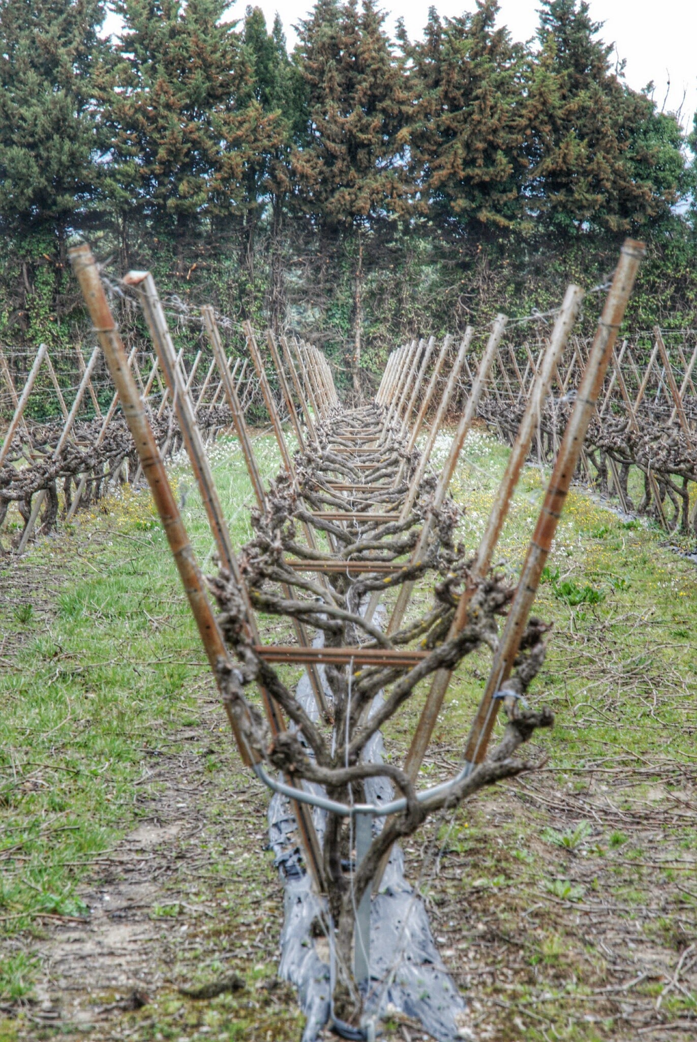 Plus loin, des pieds de vigne conduits ’’en hauteur’’ ce sont des vignes expérimentales appartenant au domaine de ‘’La Tapy’’, parcelle irriguée au goutte à goutte.