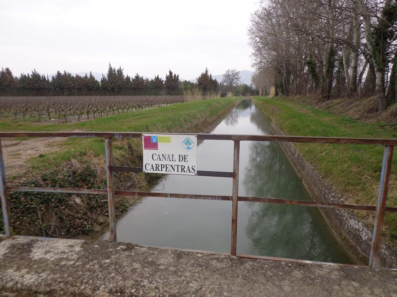 Au lieu-dit ‘’les garrigues’’ nous traversons la route et continuons le long du canal. A cet endroit, le canal se sépare en deux bras. Celui que nous longeons est dit ‘’bras principal’’ celui qui part vers la droite est appelé ‘’bras secondaire’’ il s’en va vers Monteux et Loriol. Nous traversons de nouveau le canal pour longer sur l’autre rive. On rejoint la route que nous traversons pour suivre en face un chemin bordé de cyprès, nous sommes dans une zone péri-urbaine. Sur les bords de la route, on remarque des bornes d’irrigation sous pression, utilisées pour arroser les jardins.