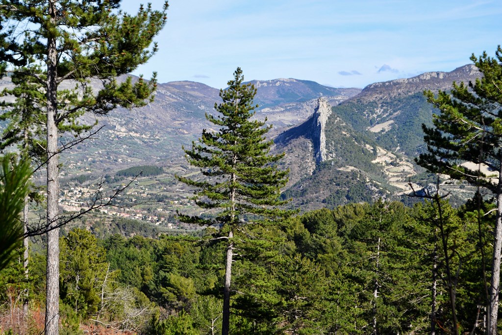 Après quelques km et un peu de dénivelée au sortir de la forêt de pins noirs, une vue s’ouvrait à nous sur les hameaux de Beauvoisin, les falaises de Malpertuis et de la Beaume noire.