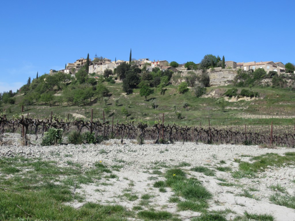 Depuis le parking proche du cimetière, nous remontons pour prendre la rue du Serre, puis un vieux chemin en bordure de colline, suivi par la petite route traversant des vignes, le chemin des Arcilliers ; un petit écart nous amène à la Chapelle Sainte Colombe. Le chemin nous conduit jusqu’à la D46 (route de Mollans ou de Vaison), que nous traversons, pour prendre presque en face, le chemin des Peyrouses.