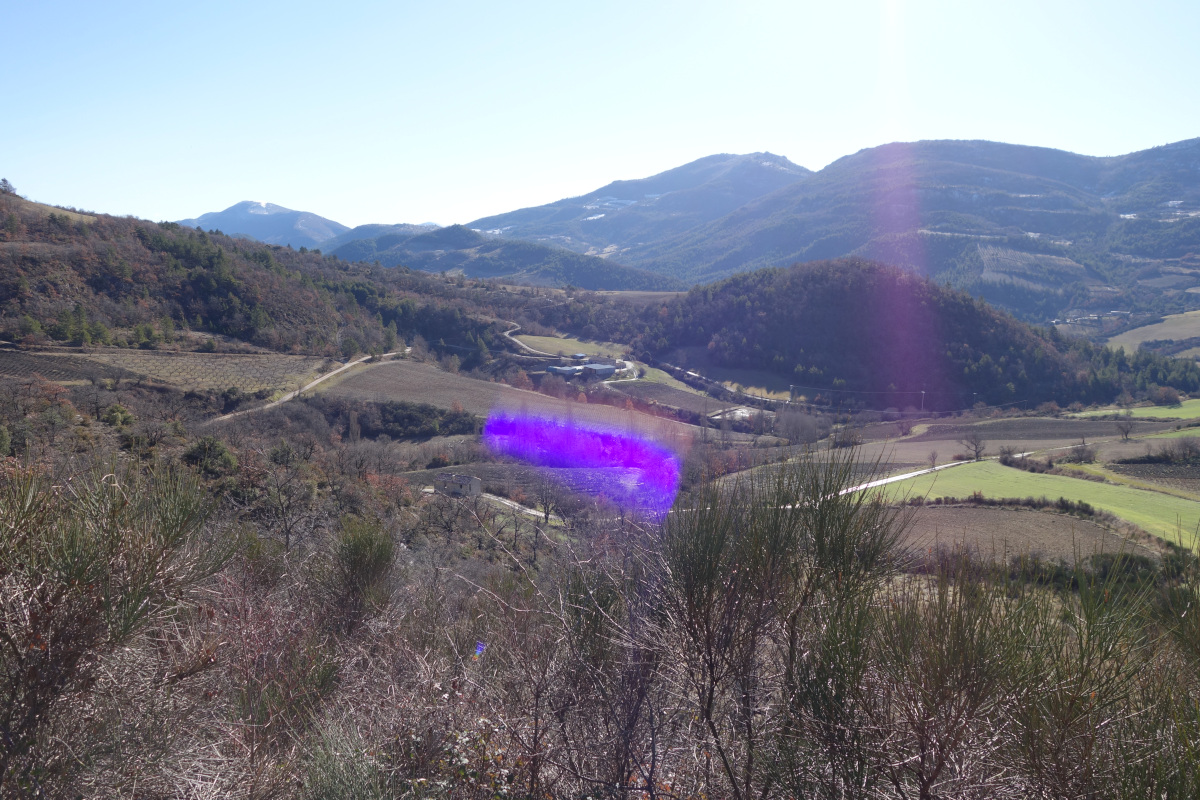 Depuis notre halte près du cimetière, un chien a décidé de nous honorer de sa compagnie et fait de nombreux allers et retour tout au long du chemin faisant notre admiration devant une telle énergie débordante. Quelques coups de feu résonnent et nous voyons au loin, sur une crête, la veste orange d’un chasseur. Puis un randonneur faisant le chemin en sens inverse du nôtre s’arrête quelques instants pour échanger quelques mots avant de poursuivre sa route après avoir décliné l’offre de Francis qui lui proposait de déguster un peu d’alcool puisque nous en étions déjà au pousse café…