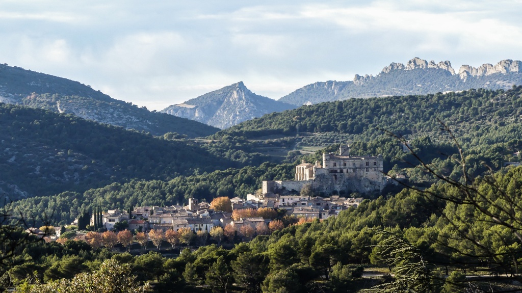 Depuis le sentier qui nous conduit au lac, nous avons une vue magnifique sur le château du Barroux, avec en fond de scène les dentelles de Montmirail.