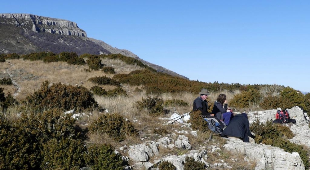J’espérais, ce dimanche, qu’on pourrait monter jusqu’au Merlu, sur la montagne d’Angèle. Malheureusement, suite à un refus catégorique du propriétaire, nous nous contenterons de suivre le GRP du tour des Baronnies, en partant de Villeperdrix jusqu’au Pas de l’Essartier via le col de Chaudebonne, puis poursuivant par les crêtes d’Angèle où des panneaux du type : randonneurs = écolos = connards nous accueillent .