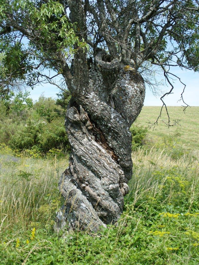 Tant de curiosités ne manquent pas de nous mettre en appétit… d’autant que nos guides, dont le savoir-faire est reconnu, ont la réputation de toujours apporter quelques délicieux produits. On ne faillira pas à la tradition, terrine, confitures, croquants seront dégustés avec délectation : pour la première fois, nous avons vu Francis (le Belge) s’agenouiller devant des dames, les yeux pétillants et les papilles en extase ! Délicieux intermède qu’il faudra interrompre néanmoins pour reprendre notre déambulation. Petites montées et légères descentes se succèdent en direction du petit village de Ferrassières de Barret. Un bel arbre au tronc torsadé, facétie de la nature, ne manque pas d’attirer l’attention de tous. Longeant une haie épaisse, un brusque remue-ménage se produit et un chevreuil « déboule » dans le champ de céréale en nous montrant son cul (excusez le mot). Un arrêt au village silencieux et désert en cette chaude après-midi permet une petite pause… à noter au passage, pour les amateurs de fossiles, de magnifiques ammonites, énormes, exposées dans la courette d’une petite maison fleurie. Le chemin, alternant avec quelques petits bouts de bitume se poursuivra parmi champs de lavande et lopins de céréales, paysage classique mais toujours apprécié, jusqu’au Hameau du Cantonnier. Le plateau permet au regard d’embrasser l’horizon, loin devant où se profilent les sommets des Alpes du Sud.