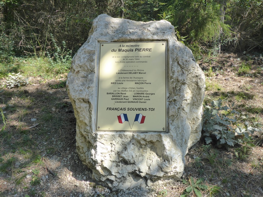 Après le pique nique de midi, nous nous rendons à la stèle commémorant la mort d'un groupe de résistants le 30 mars 1944, 2 furent tués pendant le combat qui dura 3 heures et faute de munitions, 5 autres furent fusillés par la suite. Un peu plus loin nous découvrons sur un sentier la Croix de Siméon. Celle ci est dressée à l'extrémité des terres appartenant à l'abbaye d'Aiguebelle qui les avait achetées à la famille Siméon, dont l'un des fils était prêtre et missionnaire en Afrique. Nous en profitons pour faire une pause, la chaleur commence à faire son effet.