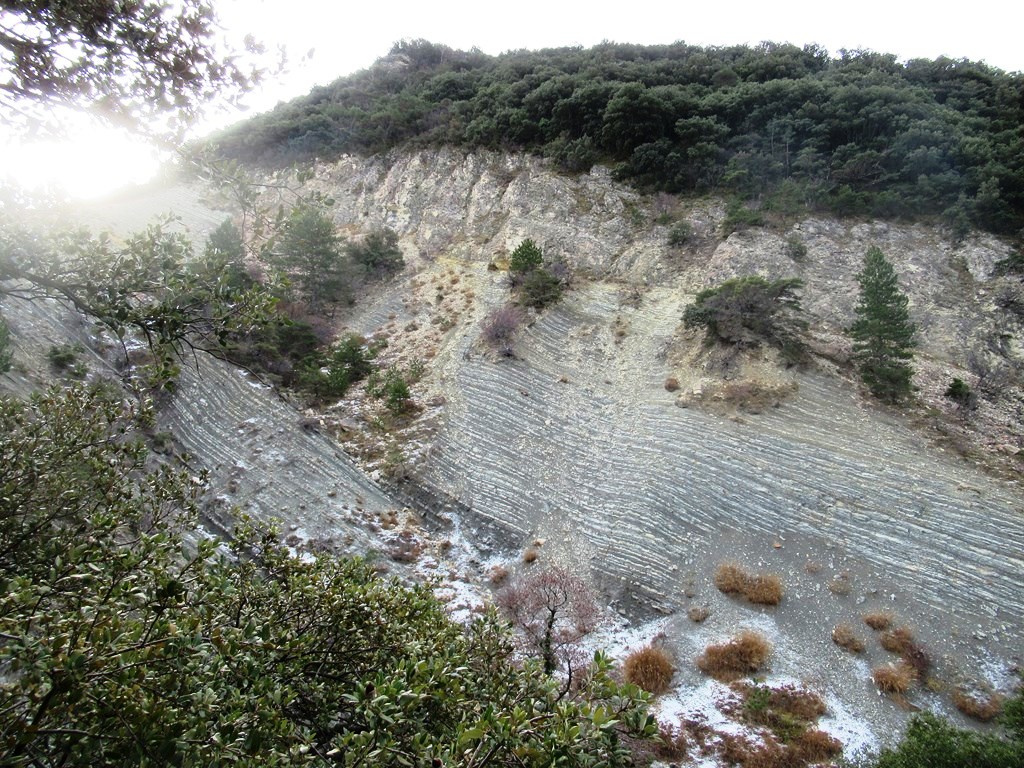 Maintenant orienté NW l’itinéraire vient couper la route qui mène à la Ferme de Célas, au point 31T 663456 4921508, juste après avoir traversé le ruisseau « Le Donjon » qui arrose Le Pègue ; il y du flot, mais pas trop, permettant aux plus habiles de rincer seulement la semelle de leurs chaussures… Après 260 m vers le nord sur la route, nous prenons un sentier le long du ravin de Combeau, orienté NNW, puis N pour contourner le sommet Odoir, et prendre la direction Ouest en bordure du « Grand Ubac ».