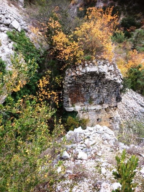 Pour une fois le départ se fait à la descente, par un bon chemin bitumé puis après 1 km première petite difficulté, le gué n’est pas à sec comme d’habitude mais c’était prévu, nous avons de bonnes chaussures ; ensuite un joli sentier en bordure du talweg qui nous amène à un belvédère où à l’époque existait une table d’orientation, disparue aujourd’hui puis arrive la partie technique de la boucle, une descente sérieuse dans un pierrier avec des parties plus ou moins vertigineuses pour les personnes qui craignent un peu ce phénomène physique ; puis en fond de ravin, un deuxième gué, toujours beaucoup d’eau mais Gaston découvre un peu en amont du ruisseau un passage plus étroit et facile à franchir sans nous mouiller les pieds, après un petite montée assez raide nous voici en présence du « Pont Romain » en bien piteux état, puis enfin la route bitumée, nous sommes sortis de la partie technique, un peu de bitume puis à travers les vergers d’oliviers ; remontée sans problème vers « Les remises » puis nous retrouvons le parking de départ.