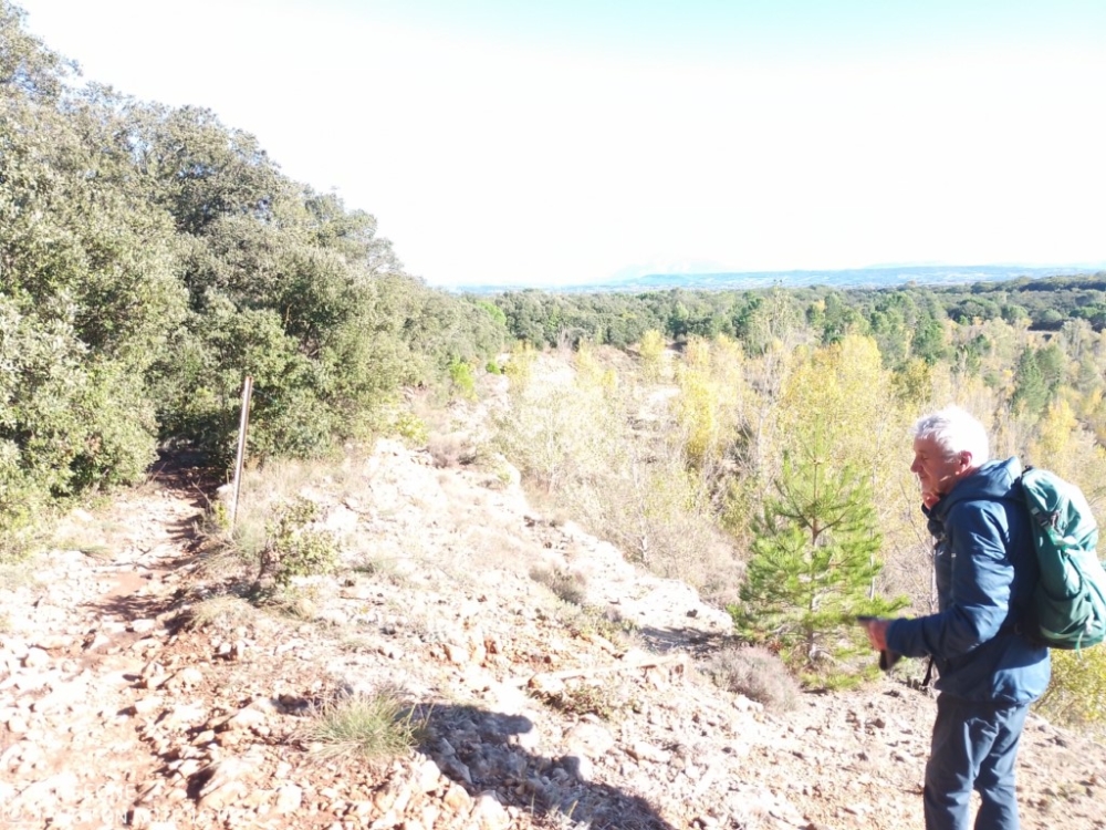 Ce petit sentier serpentant entre les arbres est la plus belle partie de la randonnée. Il nous amène en hauteur au bord d'une ancienne carrière avec vue sur le mont Ventoux et les arbres qui ont envahi toute la surface de l'étang.